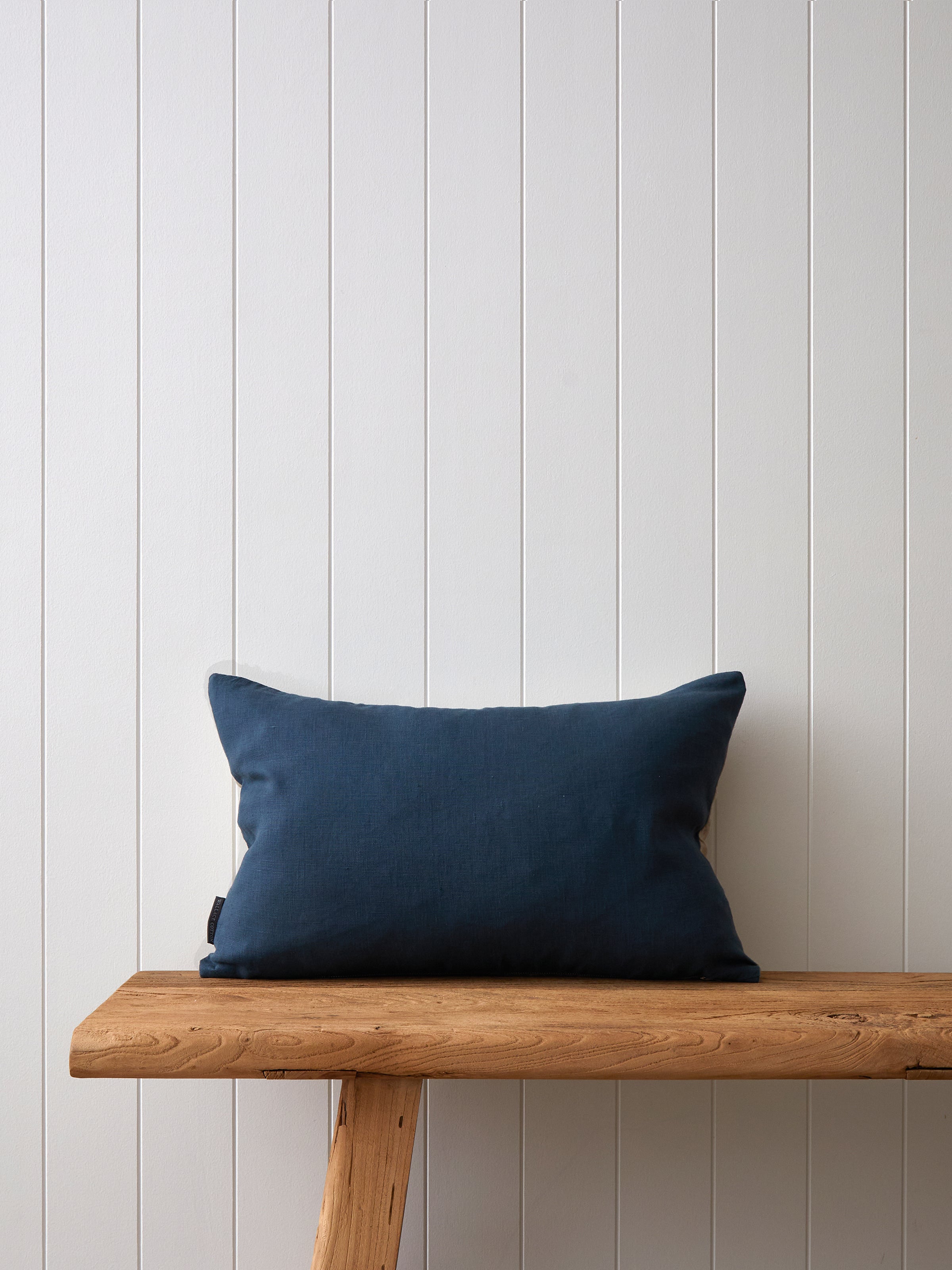Size: 35cm x 55cm. Made from pure linen with zip closure. Embroidered leaf design on front with plain navy linen reverse. Please note: COVER ONLY - cushion inner can be purchased separately. Made to fit a 40cm x 60cm rectangle cushion inner. Designed with love in NZ and made exclusively for Wallace Cotton. Please follow instructions on care label for laundering.