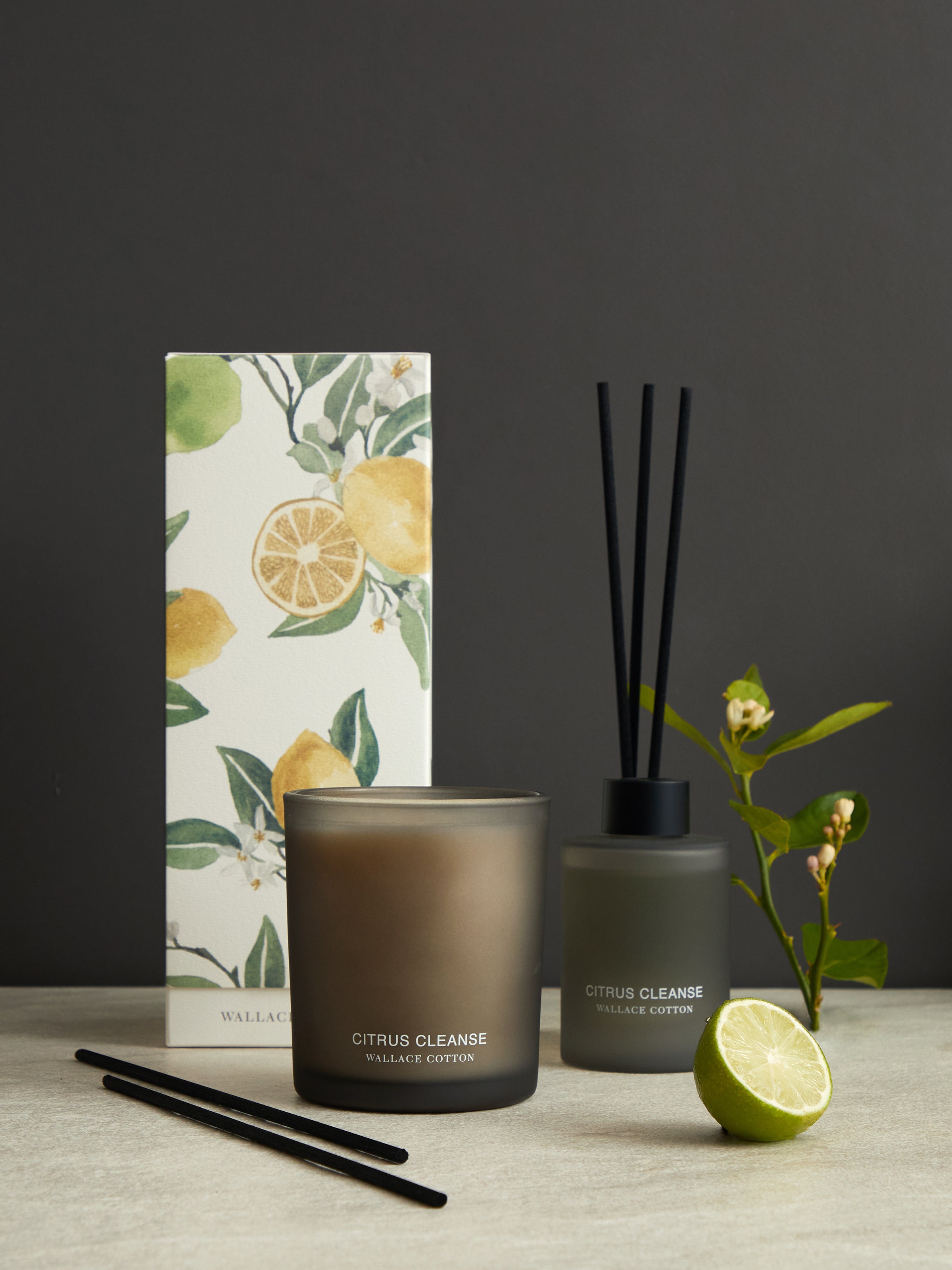 Soy wax candle in a black glass jar with metal lid. Candle weight: 300g. Size: 10cm tall x 8cm diameter. Burn time approx. 55 hours. Fragrance notes: Top notes: Lemon, Orange, Lime, Bergamot, Grapefruit, Lemongrass. Mid notes: Lemon, Rose, Orange Flower, Grapefruit, Lily. Base notes: Vanilla, Musk, Amber, Cedar, Patchouli, Vetiver. Our Wallace Cotton home fragrance collection is designed with responsible packaging. Base boxes are made from recycled materials and are re-recyclable. No foils and no laminates are used so packaging can be recycled easily in local kerb side recycling. All glass and plastic bottles are recyclable. Our home fragrance collection is 100% vegan and candles are made from 100% natural soy wax. Designed with love in NZ and made exclusively for Wallace Cotton. CANDLE CARE: Trim the wick prior to lighting the candle so the wick burns evenly and straight down. We recommend burning the candle for 2-3 hours the first time the candle is lit to encourage even burning. Trim the wick before each use.