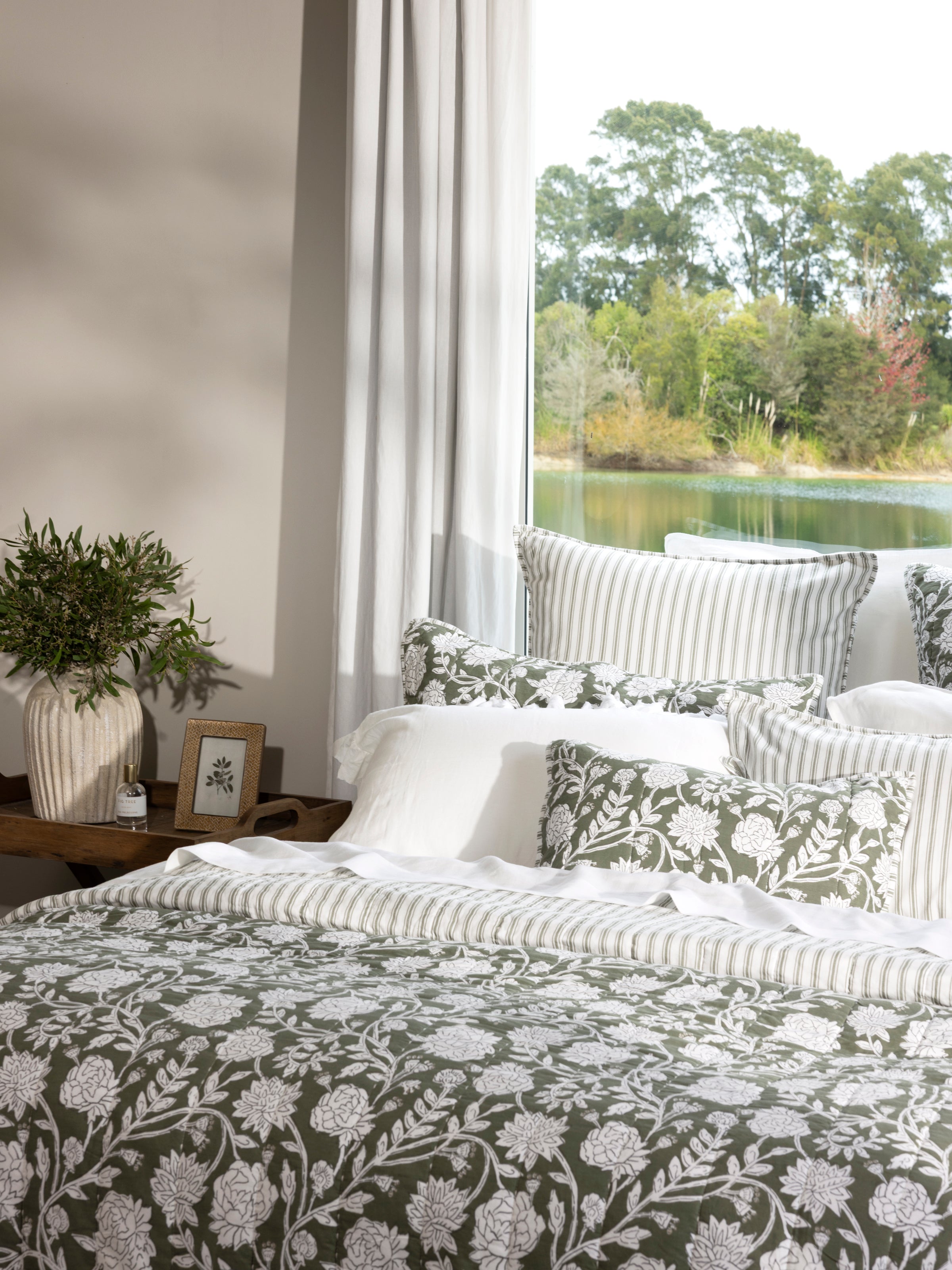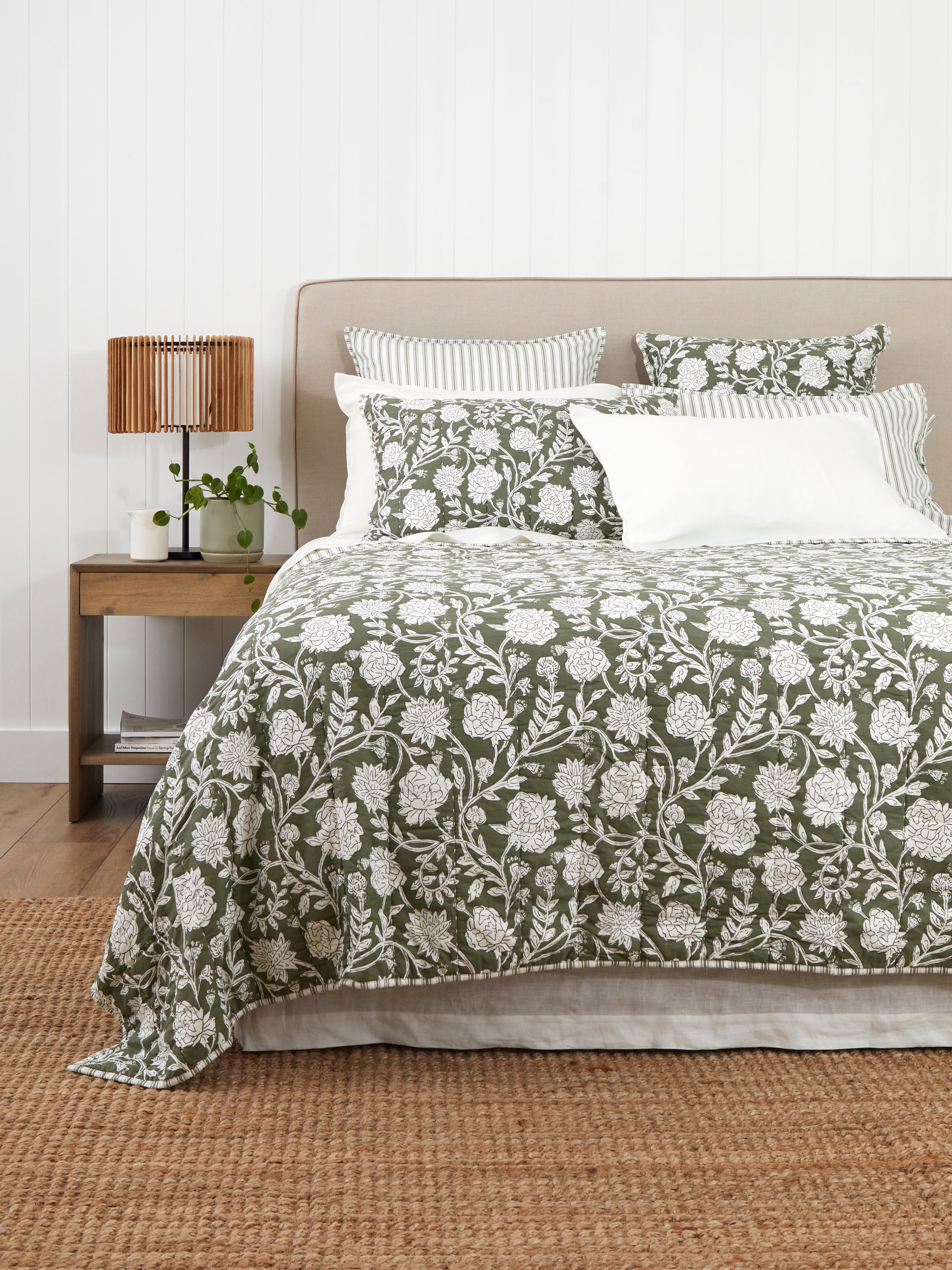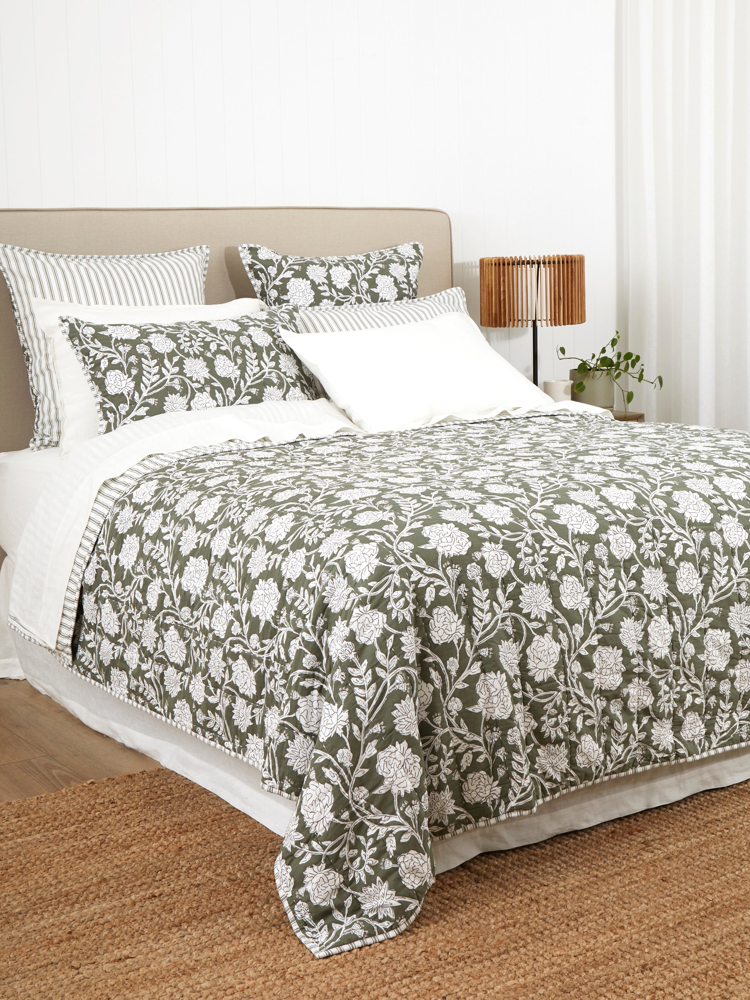Quilt only. Matching pillowcases can be purchased separately while available. Made from pure cotton with cotton fill. Floral design on front with striped reverse. Packed in a matching fabric drawstring bag for easy storage. Designed with love in NZ and made exclusively for Wallace Cotton. Please move your Elora bedding frequently as prolonged exposure to natural light or direct sunlight will result in fading. We recommend M for King Single and Double beds. L for Queen and King beds. XL for King and Super King beds. XXL for Cal King beds. Please note that not all quilt ranges include an XXL. Please follow instructions on care label for laundering.
