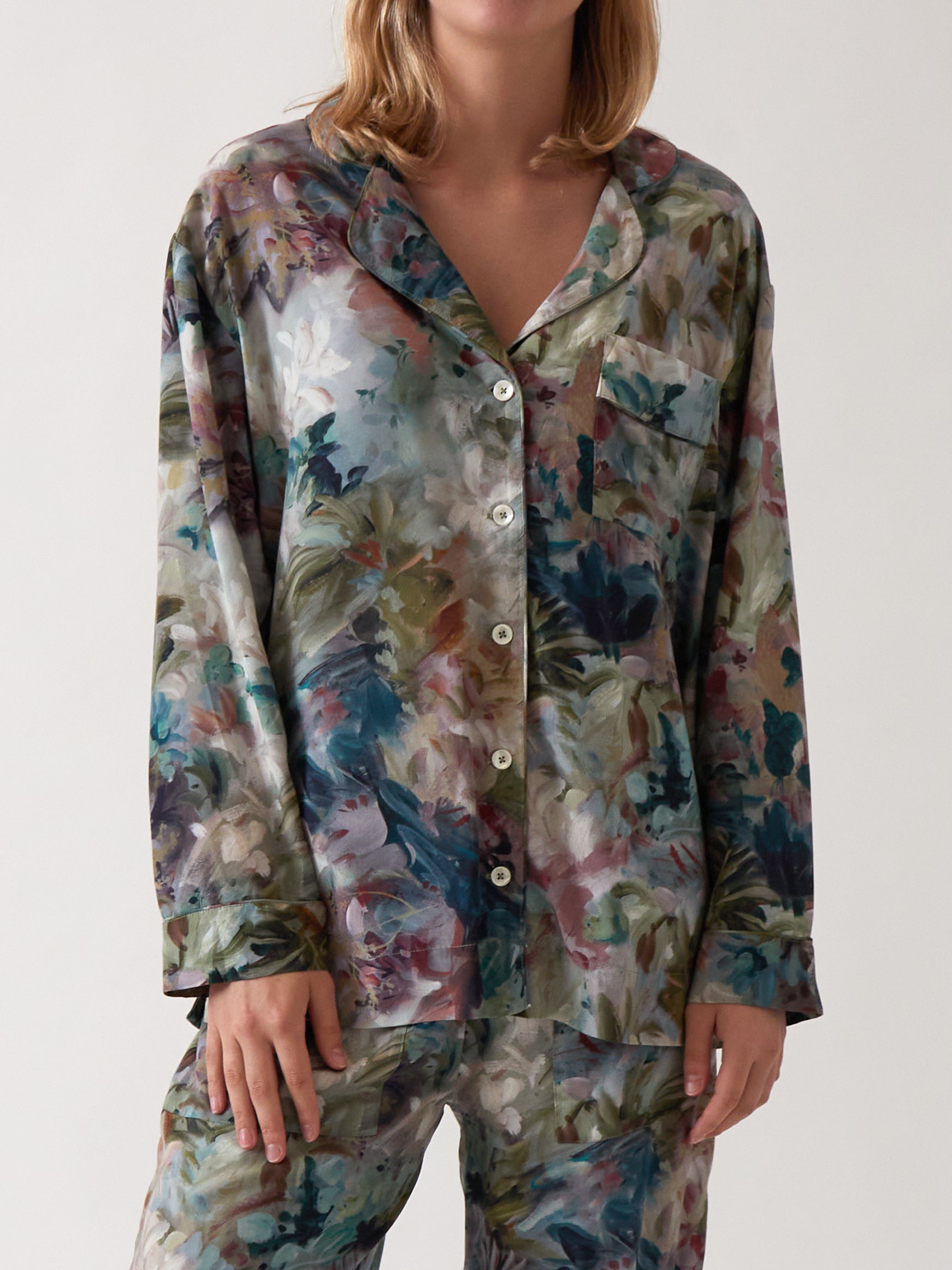 Florence sleepwear pieces feature a botanical design inspired by lush, plant-filled conservatories in moody, restful hues perfect for deep slumber. Painterly brush strokes of colour create a beautiful abstract pattern, designed in shades of green, chartreuse and deep blues with hints of merlot, pink and white. Our Florence PJ Shirt is a button down front style with long sleeves, a front patch pocket and piping trim detail in all the right places.