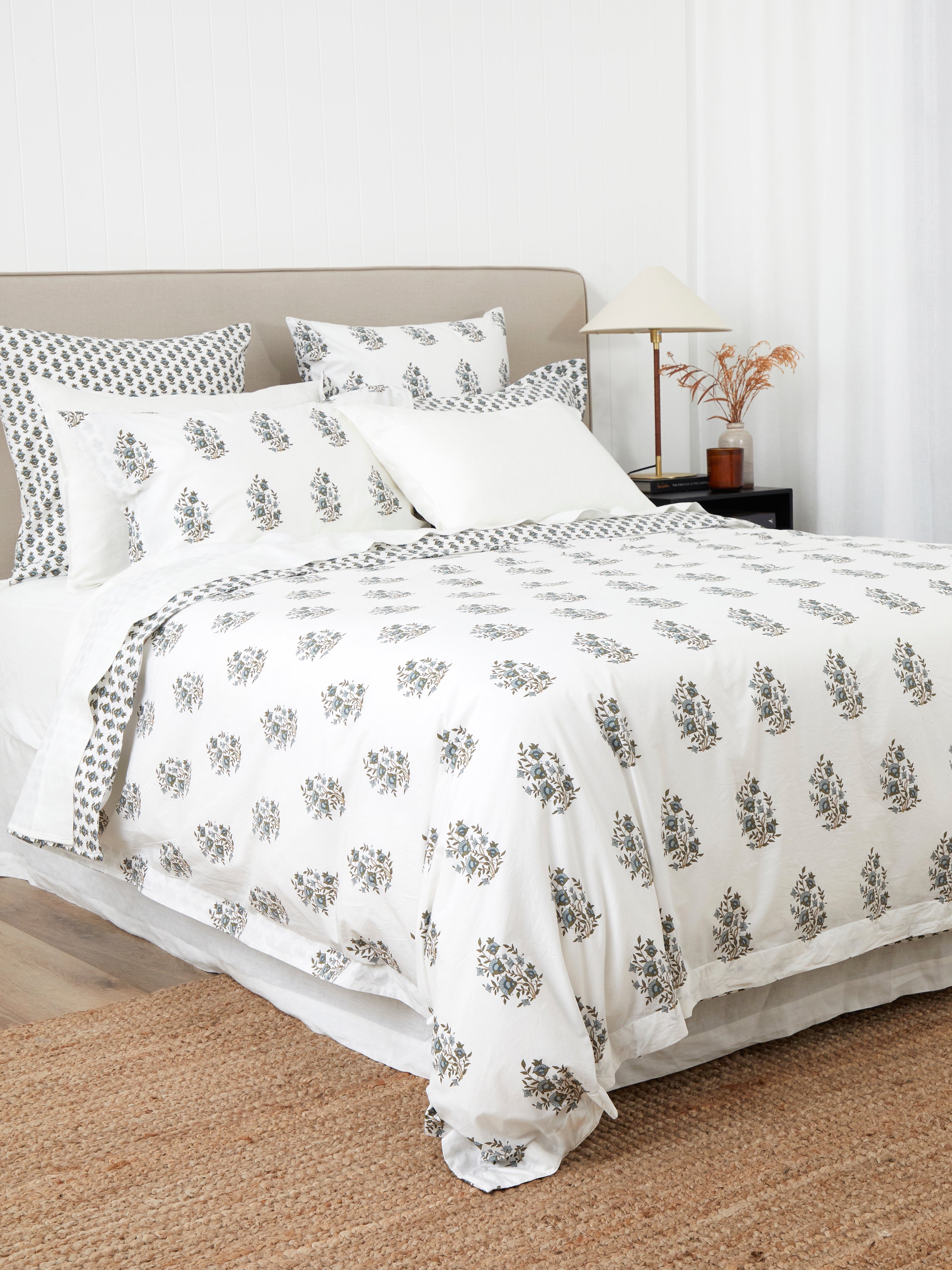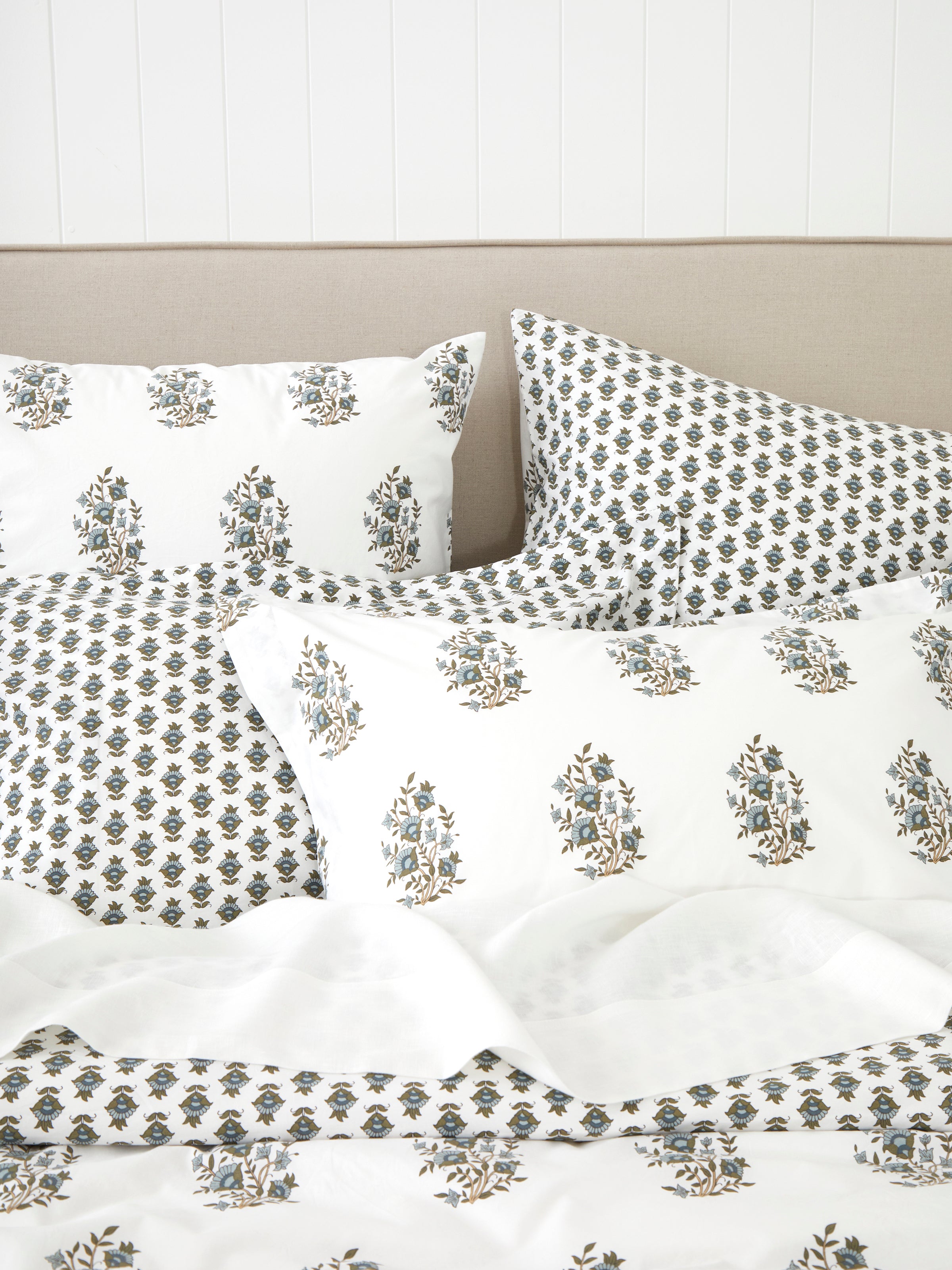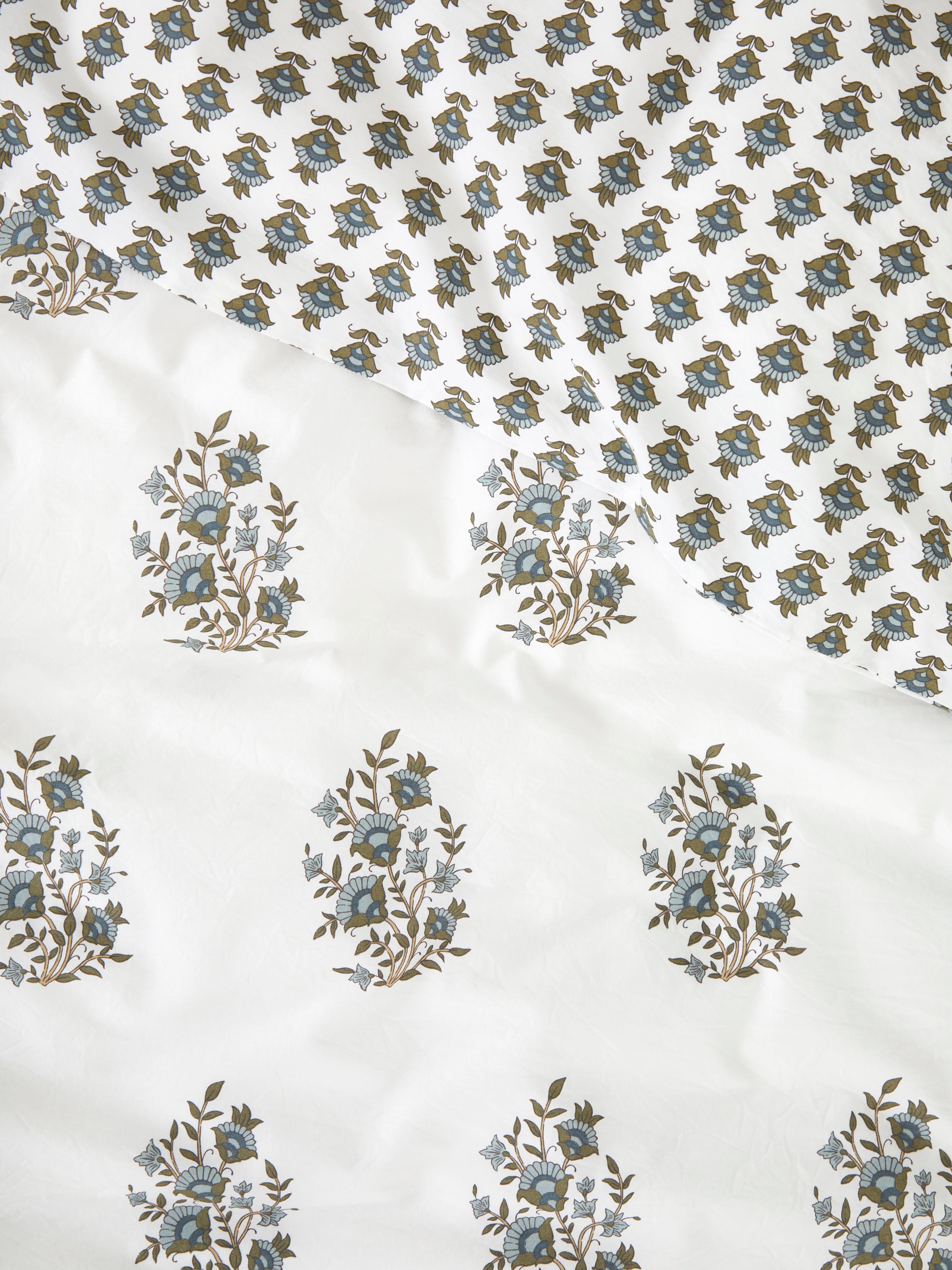 Inspired by Indian textile block printing, our Folklore bed linen features a floral motif hand-drawn in-house on fresh white. Our Folklore Duvet Cover Set is a reversible design with a smaller scale version of the floral motif on the reverse for a beautiful and versatile look. Designed in olive green, natural and blue tones, our Folklore bed linen collection is made from organic cotton.