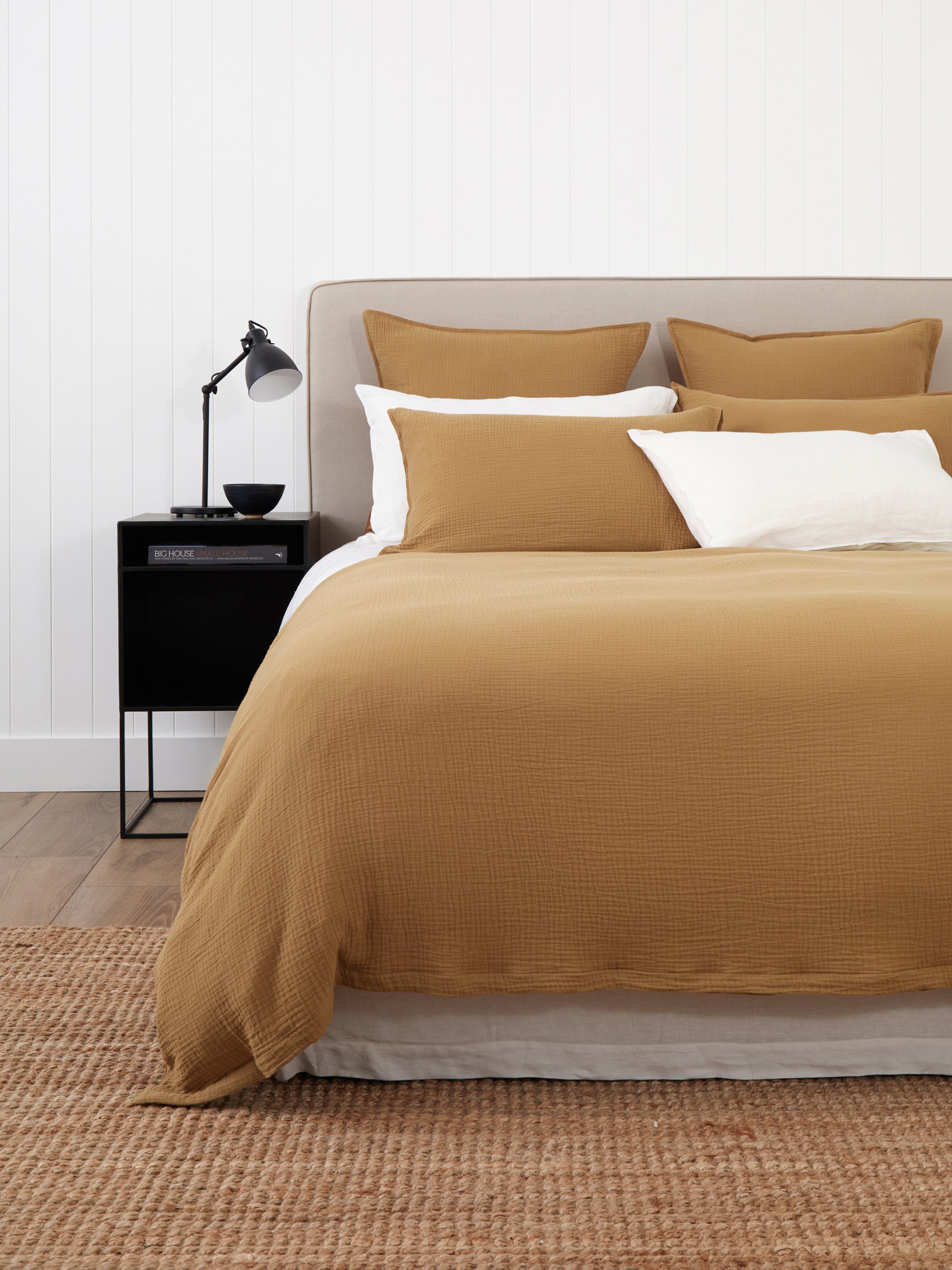In a warm, sunny hue, our Golden Bay bed linen is lovely and light. Crafted from a gently textured, double layered cotton muslin, our Golden Bay Duvet Cover Set is relaxed and versatile with an incredibly soft hand feel. The golden, tussock hue works beautifully with crisp white for a fresh look.
