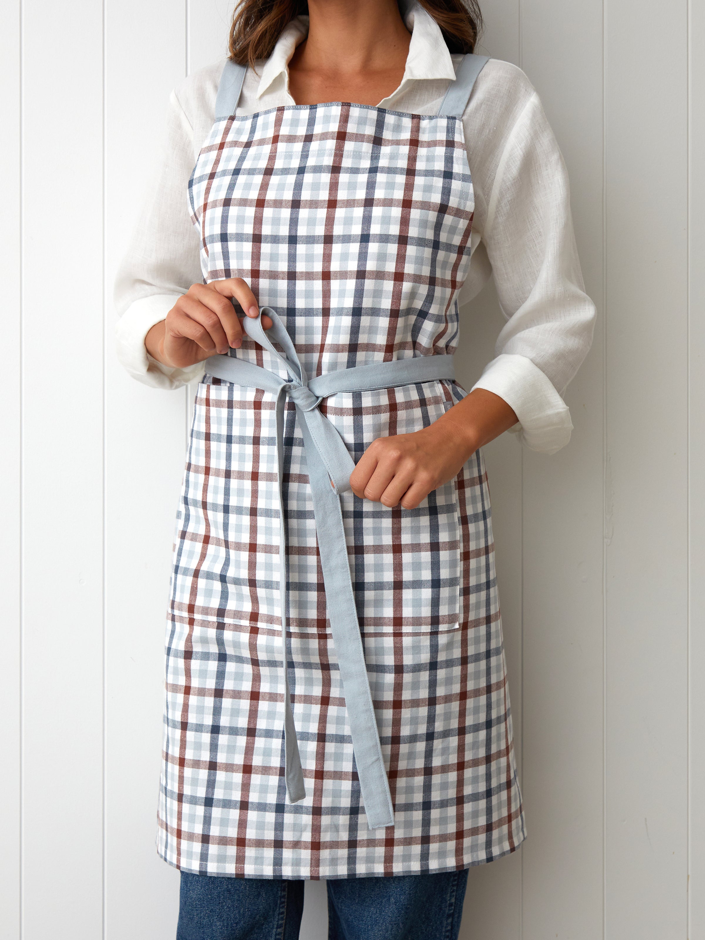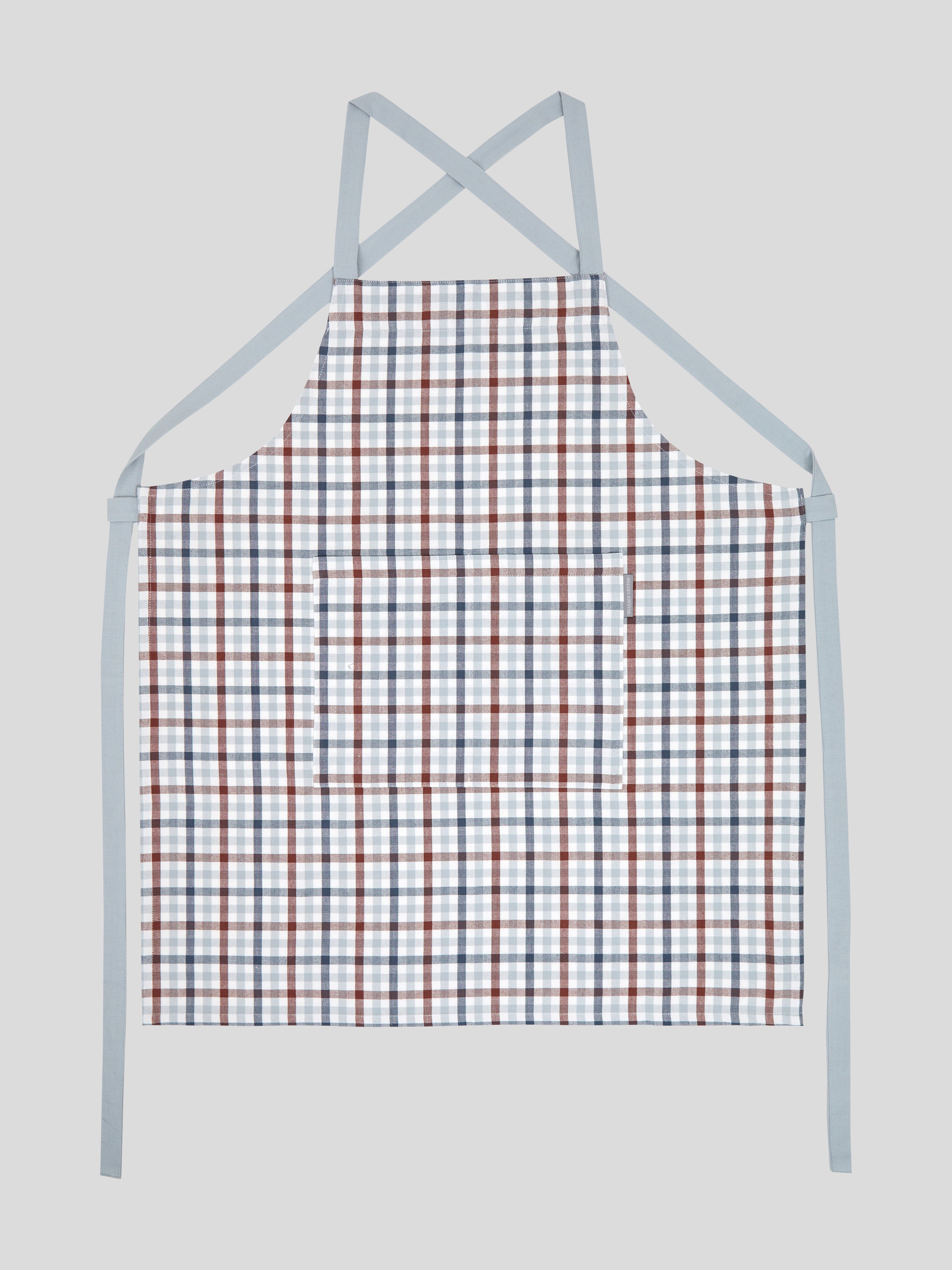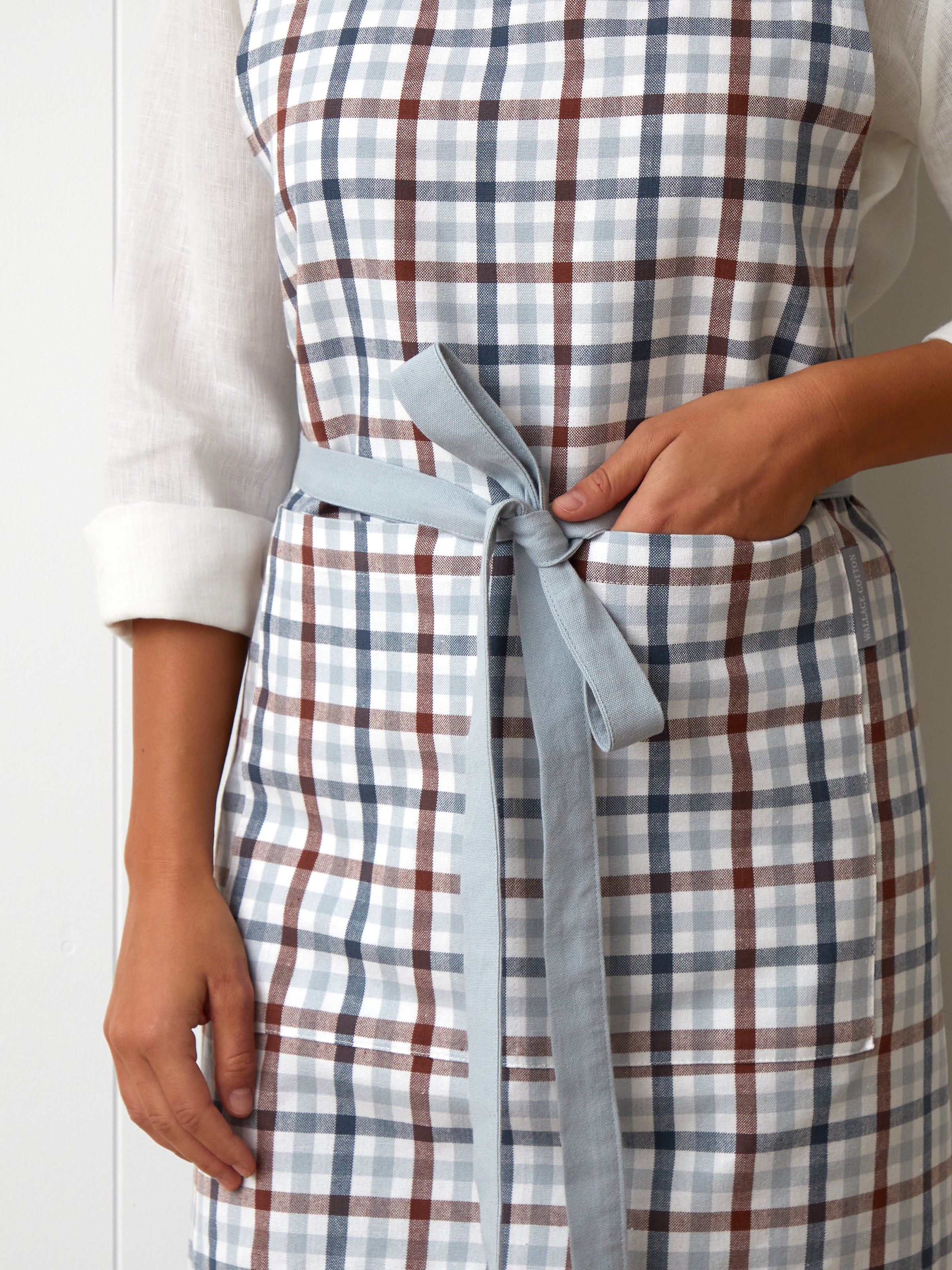 Size: 75cm x 85cm. Made from yarn dyed cotton. Apron has front pocket and cross over back/neck straps in blue. Featuring an all over check design blue, merlot, navy and white. Please follow instructions on care label for laundering. Designed with love in NZ and made exclusively for Wallace Cotton.