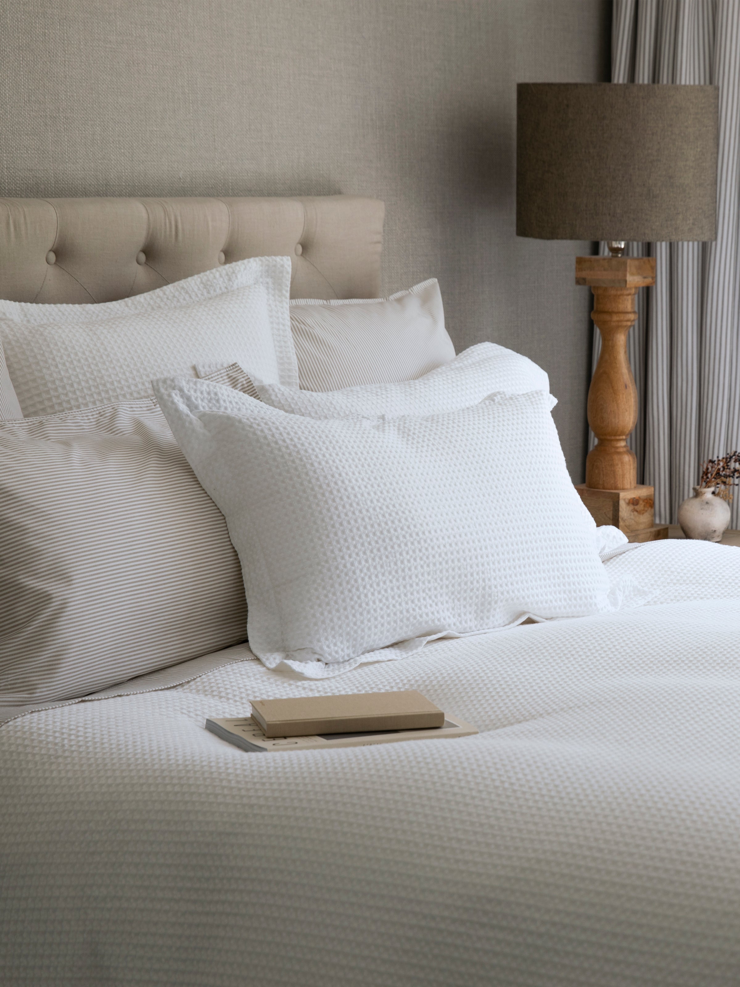 Set includes 1 x duvet cover and 2 x matching oxford pillowcases. (1 x pillowcase with S and KS sizes). Made from woven waffle cotton with a 250 thread count cotton reverse. Duvet cover has a 5cm sham and unique hidden button close. Packed in matching fabric bag for handy storage. Our bed linen has been quality checked to meet our exacting standards for size and fit. We have added shrinkage allowance to ensure a perfect fit after washing. Please follow instructions on care label for laundering. *STANDARD 100 by OEKO-TEX® Certification ensures manufacturers have adhered to environmentally friendly production methods. Products have been tested and proven free of harmful levels of toxic substances.