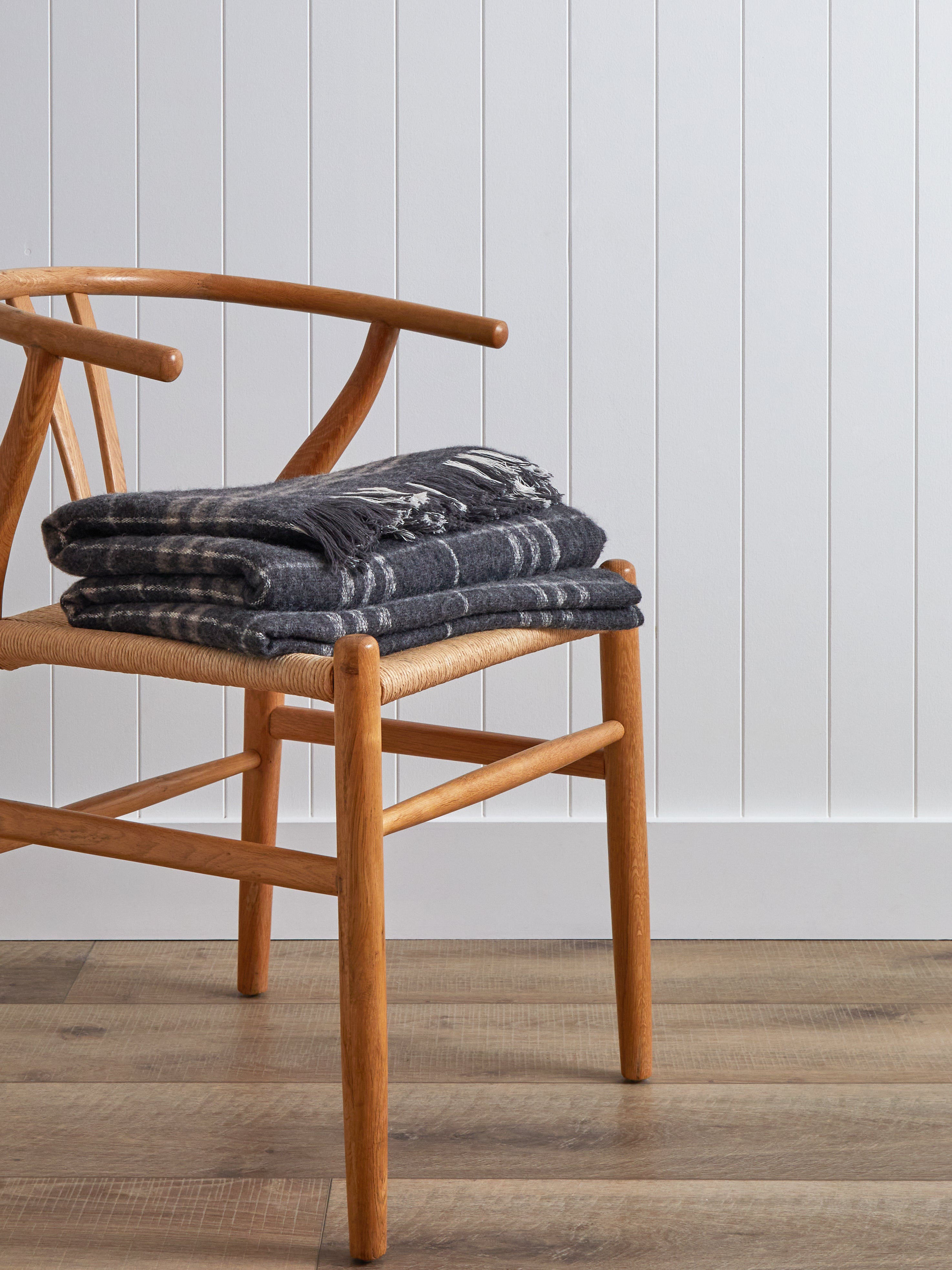 For a modern take on a classic blanket, our Kingston Woollen Blanket features a woven plaid check design in warm charcoal tones for timeless and cosy layering. The generous size of our Kingston Blanket makes it perfect for layering on beds. Woven from 65% Australian wool and 35% cotton with fringed end detailing.