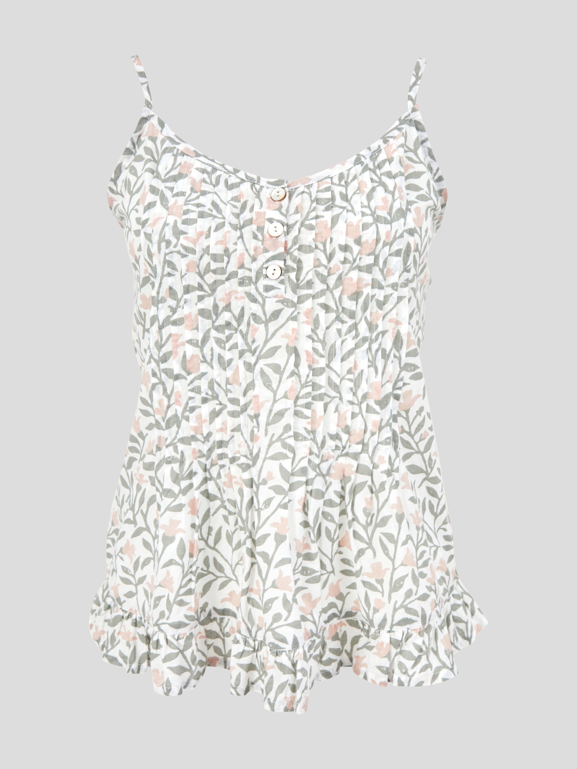 Nature inspired and natural, our Lena Sleepwear range offers elevated sleep style. Featuring a block print created in-house of a pretty pink floral with leafy foliage in muted tones for a beautiful bedtime wardrobe. Crafted from soft and sustainable organic cotton, our Lena Cami has adjustable straps, pintuck detail and a pretty frilled hem.