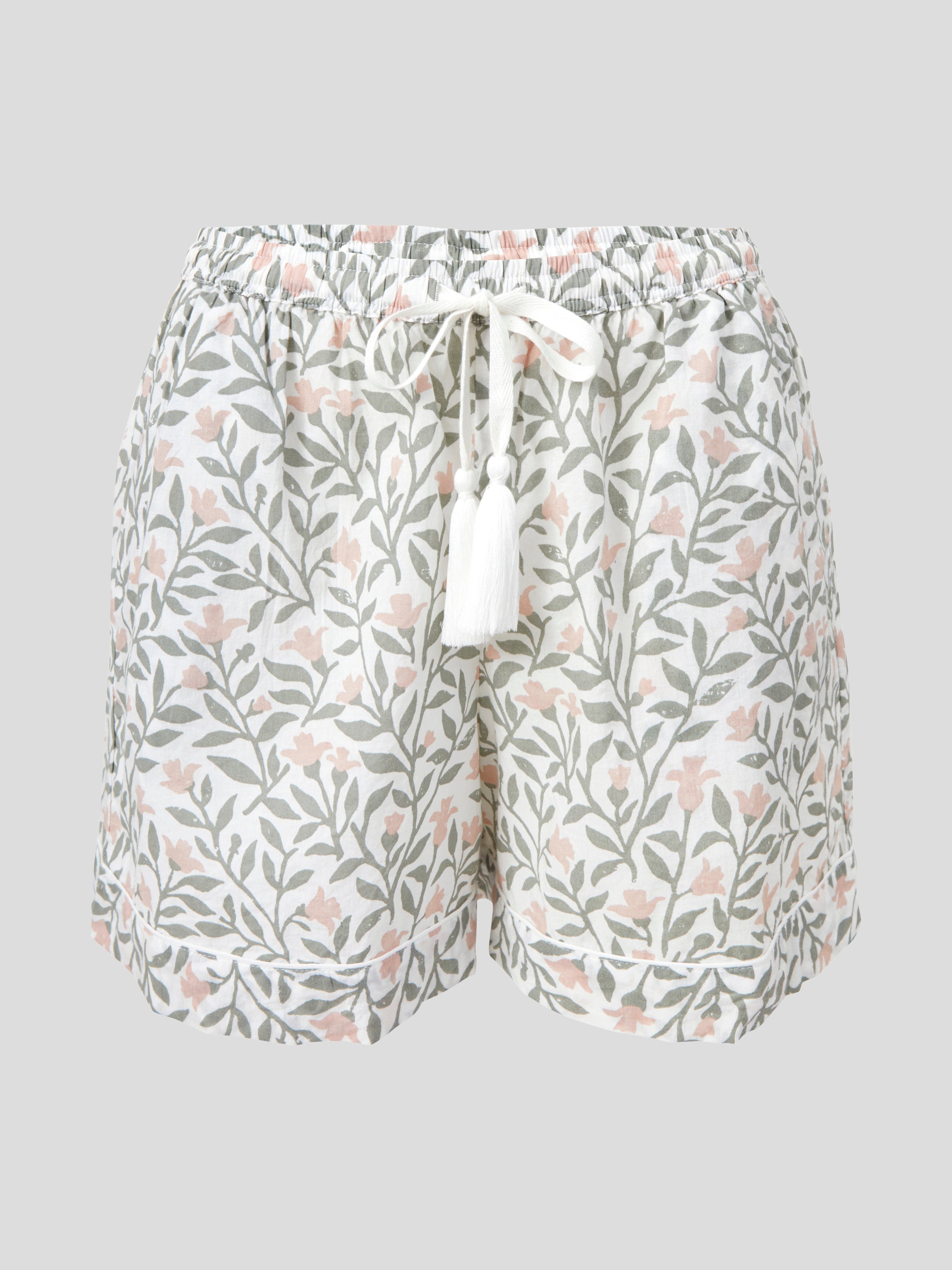 Nature inspired and natural, our Lena Sleepwear range offers elevated sleep style. Featuring a block print created in-house of a pretty pink floral with leafy foliage in muted tones for a beautiful bedtime wardrobe. Crafted from soft and sustainable organic cotton, our Lena Sleep Shorts have a soft elasticated waist for comfort and handy pockets.
