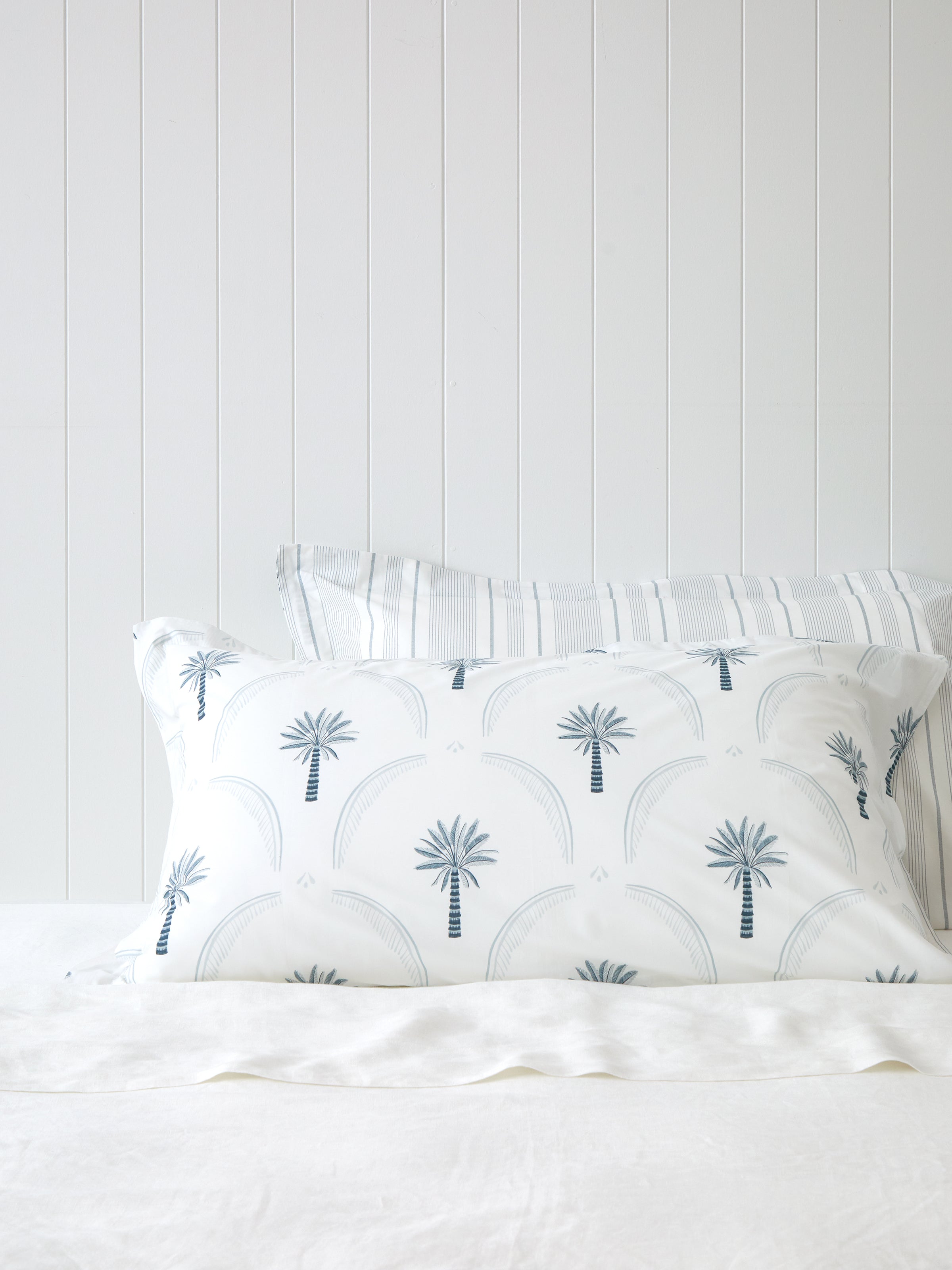 Inspired by long tropical summers, our Maldives Lodge Pillowcase Set features a palm tree motif created in-house. In soft blues and crisp white, a classic palm design has been modernised with curving arches in a scallop tile repeat pattern. Fresh, relaxed and beautiful for home or the beach house, Maldives bedding has a coordinating stripe on the reverse for versatile styling. Made from sustainable organic cotton. Please Note: our Lodge Pillowcases are larger and longer than Standard Pillowcases.