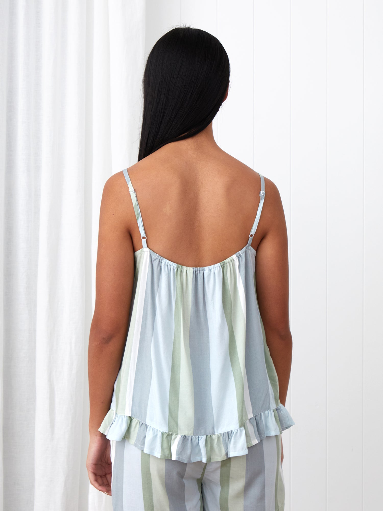 Choose Marlow Sleepwear pieces in timeless stripes for a fresh look this season. Crafted from soft plant-based modal in blues, greens and white for a beautiful, classic and comfortable sleep wardrobe. Our Marlow Cami has adjustable straps, soft back elastic for comfort and pretty frill trim detail.