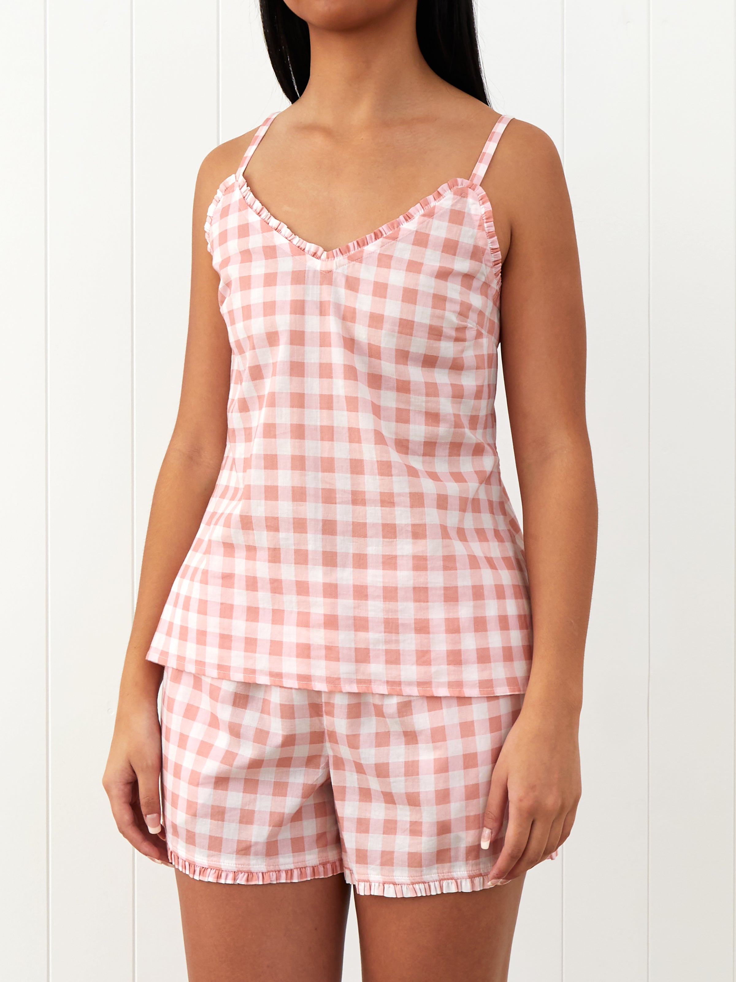 Brighten your sleep wardrobe with Molly sleepwear pieces. Fun, colourful and lightweight, Molly sleepwear is crafted from sustainable organic cotton in a cute two-tone pink and coral gingham. Our Molly Cami has adjustable straps, a V-neck, soft back elastic and a pretty gathered frill at neckline.