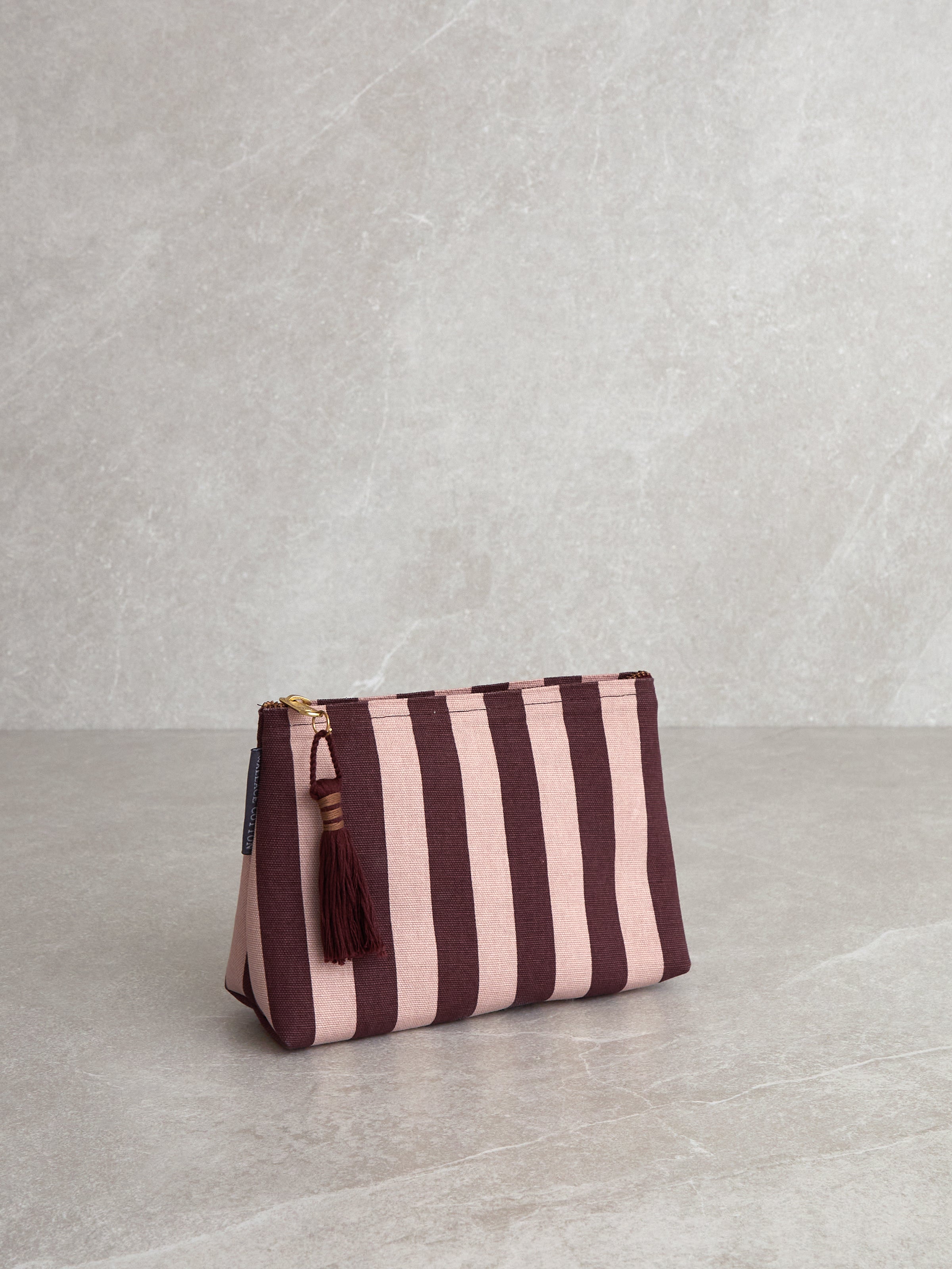 Size: 23cm x 13cm x 8cm. Outer made from cotton with PVC waterproof lining inside. Pink and merlot stripe design with tassel detail and zip closure. Spot clean only. Designed with love in NZ and made exclusively for Wallace Cotton.