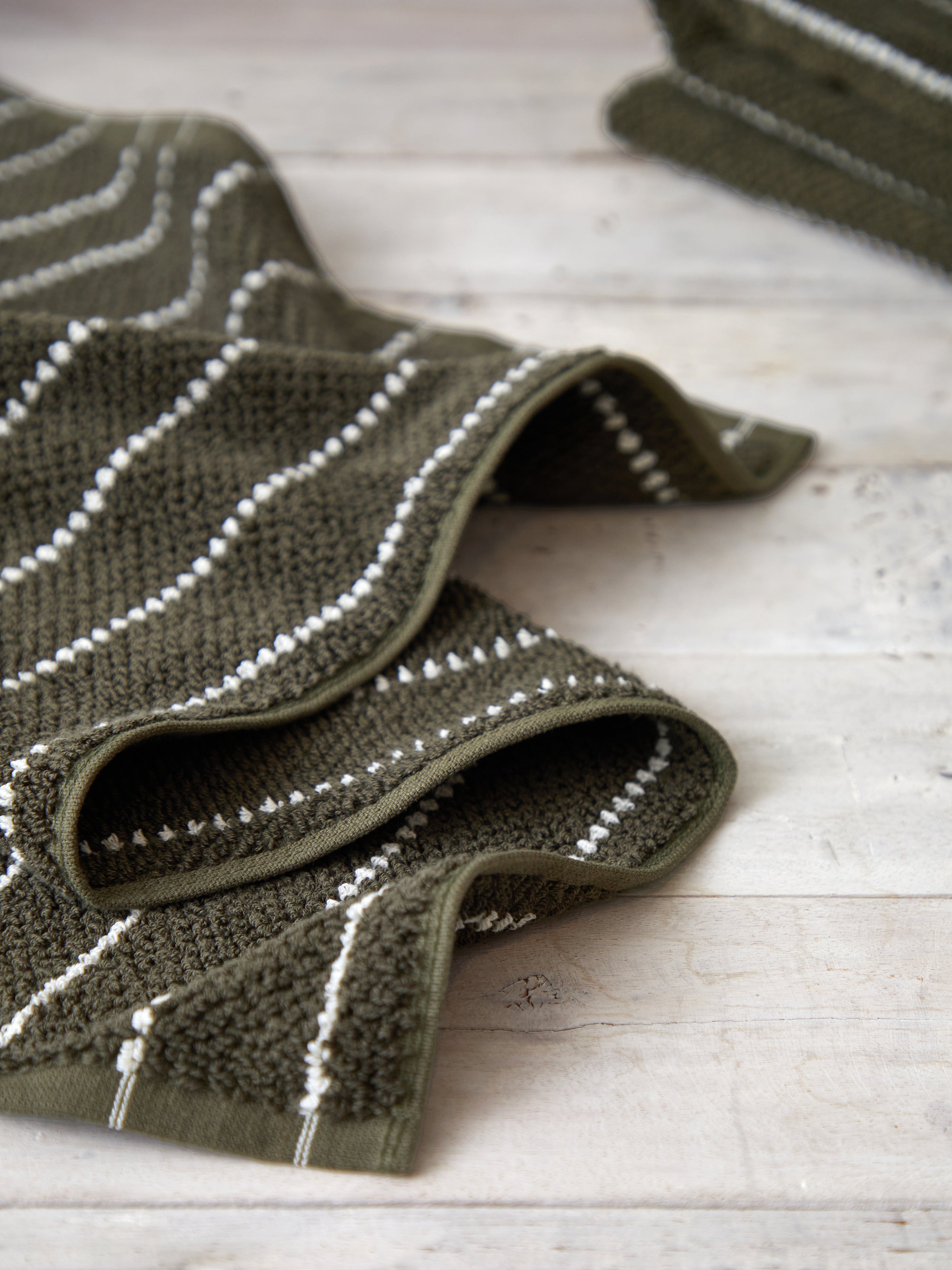 Wrap yourself in the comfort of plush towels to elevate your daily rituals. Our Villa Towel Set includes everything you need for an instant bathroom refresh and for easy gifting. Designed in practical darker colours of olive green and navy and featuring a fine stitched stripe detail in contrasting white. Our Villa Towel Set includes two bath towels, two hand towels, two face cloths and a bath mat and is made from 2 ply combed yarn dyed cotton.