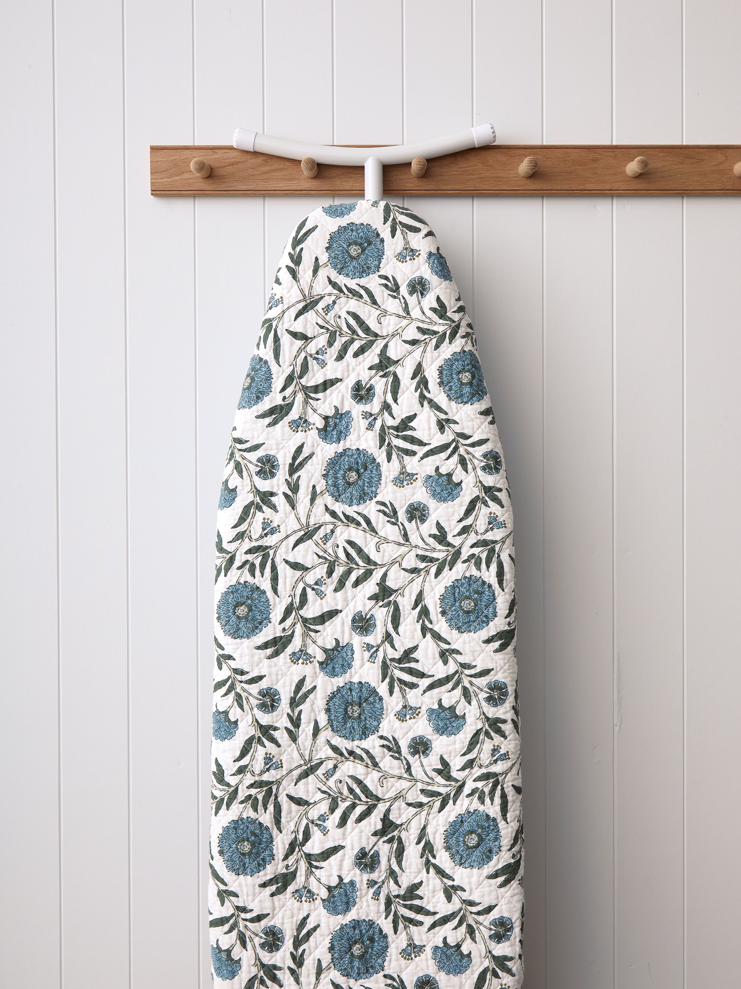 Discover our Willa Ironing Board Cover designed to make every day ironing (or monthly ironing - no judgement here!) more beautiful. Featuring a block-print inspired botanical pattern in fresh blue and green tones with a coordinating ticking stripe on the reverse and diamond shaped quilting pattern. Our Willa quilted accessories are made from pure cotton with cotton fill.